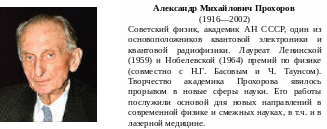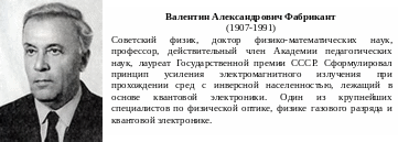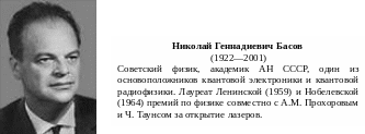 Возможность усиления электромагнитного излучения в среде с инверсией населенности была показана В.А. Фабрикантом в 1940 г. [2], но не была должным образом оценена. Практически эта возможность была реализована при создании квантовых генераторов микроволнового диапазона советскими учеными А.М. Прохоровым и Н.Г. Басовым [3] и группой американских ученых во главе с Ч. Таунсом в 1955 г.[4], за что трое поименованных были удостоены Нобелевской премии. Созданный ими прибор получил название мазер ― аббревиатура английского термина «Microwave Amplification by Stimulated Emission of Radiation».