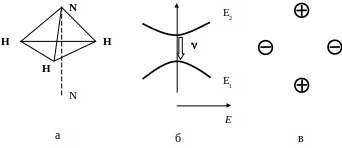 Молекула аммиака имеет форму пирамиды с треугольным основанием. В вершине пирамиды расположен атом азота, а в углах основания ― атомы водорода (см. рисунок 2.3а). При этом атом азота в молекуле может занимать два равноправных положения выше и ниже основания пирамиды. Это ведет к тому, что у молекулы появляются два энергетических состояния, разность энергий между которыми соответствует частоте ν =23 870 МГц. В электрическом поле из-за явления Штарка разница между энергиями уровней Е2 —Е1 увеличивается по мере роста напряженности поля Е (рисунок 2.3б). Таким образом, с ростом напряженности электрического поля энергия верхнего состояния Е2 растет, а нижнего Е1 уменьшается. Рассмотрим квадрупольный конденсатор, образованный четырьмя параллельными стержнями (рисунок 2.3в). При указанной на рисунке полярности заряда конденсаторе напряженн