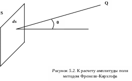 Предположим, что нам известно распределение по поверхности S (рисунок 5.2) комплексных амплитуд световой волны v(s), распространяющейся вправо, а комплексные амплитуды волны за пределами поверхности S равны 0. Тогда в соответствии с принципом Гюйгенса-Френеля комплексная амплитуда волны v(Q) в произвольной точке Q, отстоящей от поверхности на расстояние r в направлении под углом θ по отношению к нормали к поверхности S будет суперпозицией вторичных сферических волн, исходящих из поверхности S с соответствующими комплексными амплитудами.