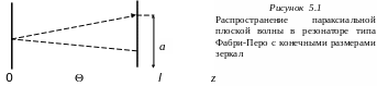 Полагая (см. Л2), что между плоскопараллельными круглыми зеркалами распространяется плоская волна, мы записывали условие резонанса как условие стоячей волны и , соответственно, получали оценку добротности такого резонатора. Допустим теперь, что внутри симметричного резонатора длиной l, радиусом зеркала а и отражением от зеркал по интенсивности R могут распространяться волны, падающие на зеркала не нормально, а под небольшим углом. Если такая плоская волна успеет отразиться (1/1–R) раз, прежде чем выйдет за пределы отражающих дисков, то соответствующий резонанс будет обладать примерно вдвое меньшей добротностью, чем для нормально падающей волны (см. рисунок 5.1).
