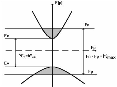 Но что это означает? Это означает, что появление носителей в зонах должно быть обусловлено обязательно отличным от теплового способом, то есть носители должны быть принципиально неравновесными (избыточными). Акт, приводящий к появлению избыточных носителей в разрешенных зонах, называется инжекцией. Время жизни инжектированных носителей, или время установления термодинамического равновесия после акта инжекции, составляет 10-8 – 10-9 с. Это время иначе называют временем межзонной термализации. В течение времени, малого по сравнению со временем межзонной термализации, можно рассматривать электронный и дырочный газы по отдельности в квазиравновесных состояниях и вводить для каждого из них свой уровень Ферми (квазиуровни Ферми Fn и Fp). Правомерность такого рассмотрения оправдана тем, что инжектированные носители в зонах очень быстро (за время порядка 10-13 сек) приходят в квазиравновесное состояние (внутризонная термализация) с распределением типа Ферми.