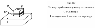 Лазерное излучение при инжекции носителей через p-n переход получено во многих полупроводниковых материалах. Наиболее распространены лазеры на арсениде галлия. Устройство излучающего элемента такого лазера схематически показано на рис. 9.3. [ 2 ].