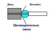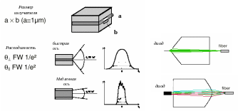Для обеспечения осесимметричной фокусировки излучения лазерного диода необходимо использовать оптический элемент с разной оптической силой по быстрой и медленной осям (рис.9.6). Дальнейшее наращивание выходной мощности возможно путем суммирования интенсивности излучения отдельных лазерных диодов, разнесенных пространственно или выращенных в едином полупроводниковом кристалле в виде одномерной или двумерной решетки. При этом вновь встает проблема сведения суммарной мощности в одно пятно с малыми размером и числовой апертурой. Суммирование может быть осуществлено либо пространственно с использованием дискретных оптических элементов (призм и зеркал), либо с использованием диодов с волоконным выводом излучения, а суммирование производить в волоконно-оптических сумматорах. В волоконной технике лазерный диод с волоконным выводом излучения называют «пигтелированным» - от английского pig tail («поросячий хвост»).