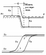 Появление областей 1 и 2, «переполненных» неравновесными носителями, и обуславливает инверсную заселенность, дающую всплеск излучательной рекомбинации, причем с преобладанием вынужденного излучения (тем большего, чем больше доля неравновесных носителей среди всех рекомбинирующих). На границах перехода при инжекции концентрация носителей меняется в 104 раз.
