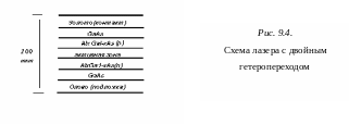 Для борьбы с пространственной неоднородностью накачки применяется изящный технологический прием: формирование гетероструктуры p-n перехода. Гетеропереходом называется такой p-n переход, у которого монокристаллический слой одного полупроводника наращивается на монокристаллической подложке другого полупроводника (в отличие от гомоперехода, где используется один и тот же полупроводник). Чтобы при этом не нарушалась монокристалличность всего образца, необходимо тщательно подбирать контактирующие материалы. Используется чаще всего контакт (твердый раствор) GaAs и AlAs. У них одинаковый тип решетки и одинаковый период, поэтому замещение алюминия галлием и наоборот происходит практически без появления дефектов решетки. На рис. 9.4 представлена схема лазера с двойным гетеропереходом.