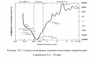 ирокое применение Er:YAG лазеров в биомедицинских исследованиях обуславливается максимальным коэффициентом поглощения излучения длиной волны 2,94 мкм жидкой водой, для которой = 10,00013,000 см1 (рисунок 10.7).