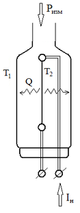Первые реализации теплового вакуумметра были предложены Пирани в 1906 г. (рис. 9) [15]. В данном типе вакуумметров остаточное давление в камере измеряется пересчетом известных зависимостей теплопроводности газа от давления. Таким образом, измеряя разность температур Т1 и Т2, возникающую в результате выделения теплоты Q при протекании тока Iн через нить накала, оценивают остаточное давление.