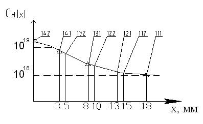 Глубина диффузии и распределение концентрации атомов водорода вдоль оси х которые очень медленно меняются со временем, согласно уравнению нестационарной диффузии (второму закону Фика),
