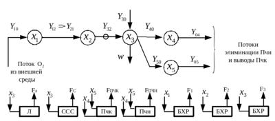 Л – система легких; ССС – сердечно-сосудистая система и система крови; Пчк – система почек; Пчн – система печени; Бхр – биохимический регулятор; w – нормальный расход энергии. Точкой обозначен комплекс метаболических процессов в организме; x1 – О2 в Л;