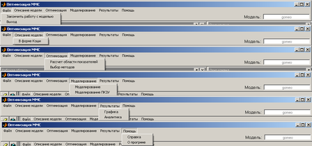 Оболочка ПС «МОМДИС» позволяет в режиме диалога изменять параметры системы, задавать начальные данные, выбирать методы моделирования и оптимизации, проектировать в интерактивном режиме параметризованные программно-корректируемые законы управления, производить обработку и анализ полученных результатов. Разработан оригинальный многооконный пользовательский интерфейс. Переработана система отображения информации, которая позволяет одновременно просматривать необходимое количество графиков нескольких моделей и выполнять с ними необходимые действия.