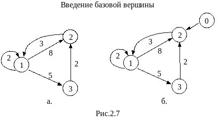 Наряду со значением стоимости кратчайшего пути в большинстве случаев следует и определить этот путь, т.е. найти набор дуг, составляющих этот кратчайший путь. Здесь также существуют соответствующие алгоритмы, например, алгоритм Дейкстры, который находит кратчайший путь и его дуги из одного источника (из базовой вершины) в любую другую. Если, в общем случае, в графе нет базовой вершины, то ее создают, вводя новую вершину и дугу с нулевым весом. Так на рис.2.7б показано введение для графа (а) базовой вершины a0 (б).