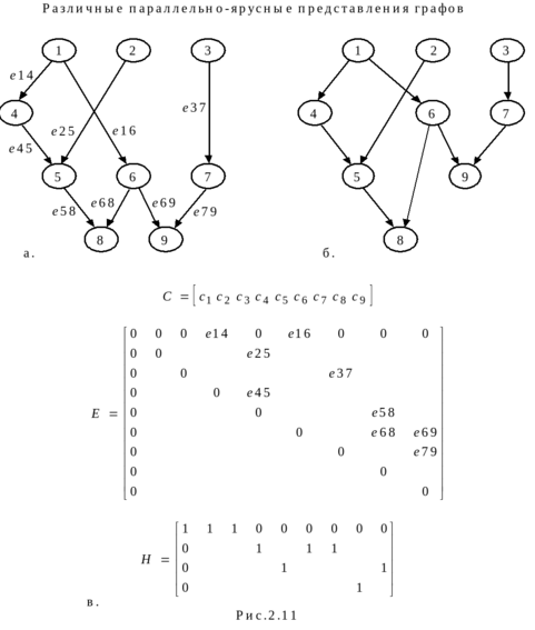 На рис.2.11а и 2.11б приведен некоторый граф алгоритма обработки, представленный в параллельно-ярусной форме.