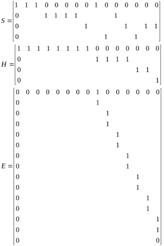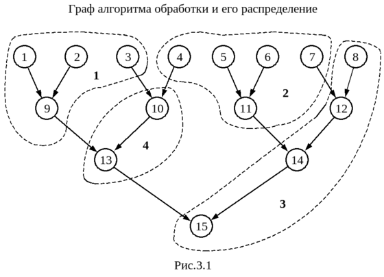 Допустим, что алгоритм обработки представлен на рис.3.1 и там же дано распределение его по подграфам (вершинам сети процессоров). Тогда матрицы S, H , E , Q , F ,