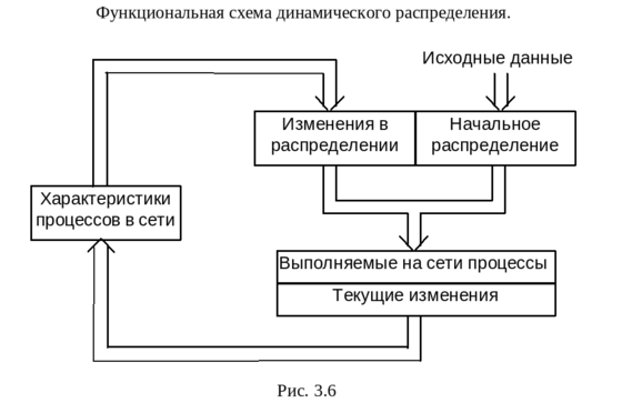 На рис.3.6 приведена функциональная схема динамического распределения. Она включает в себя: блок нахождения начального распределения; блок текущего измерения состояния процессов и процессоров; блок вычисления обобщённых характеристик процессов и процессоров и блок внесения изменений в текущее (существующее) распределение.