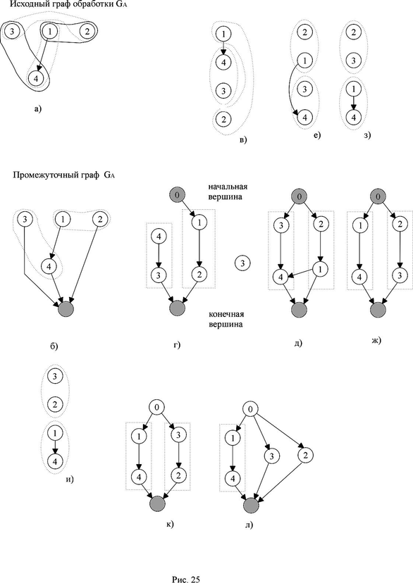 Добавим к графу GА исходную (нулевую) вершину с номером равным 0 и нулевым весом и соединим исходную вершину со всеми другими вершинами GА , не имеющими входных дуг. Теперь в графе GА имеется нулевая вершина и конечная вершина (рис.3.4г). Следовательно можно построить расписание и найти длину расписания как длину критического пути из 0 вершины в конечную вершину.