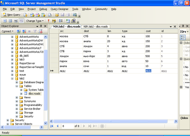 Ознакомившись с методическими указаниями и разобрав приведенные в нем примеры, студент может получить у преподавателя свой вариант задания и приступить к его выполнению. Целью лабораторной работы является практическое изучение возможностей постреляционного расширения языка SQL для создания хранимых процедур и функций и выполнения рекурсивных и транспонирующих запросов на примере Transact-SQL в среде Microsoft SQL Server Management Studio.
