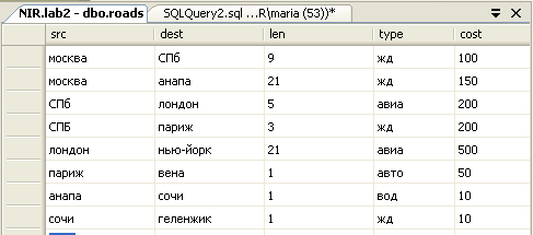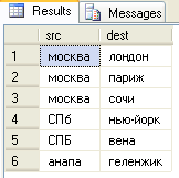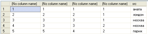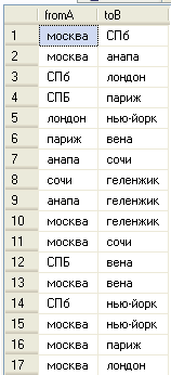 При этом, в результат запроса не попадут дороги между городами без пересадки и с двумя пересадками. Если выполнить соединение таблицы с самой собой дважды, то получим дороги только с двумя пересадками, и так далее.