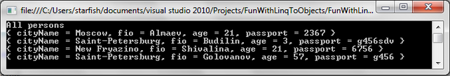 | var persons = new[]{ new { cityName = "Moscow", fio = "Almaev", age = 21, passport = "2367" }, new { cityName = "Saint-Petersburg", fio = "Budilin", age = 3, passport = "g456sdv" }, new { cityName = "New Fryazino", fio = "Shivalina", age = 21, passport = "6756" }, new { cityName = "Saint-Petersburg", fio = "Golovanov", age = 57, passport = "g456" } }; Console.WriteLine("All persons"); var allPersons = from p in persons select p; foreach (var pers in allPersons) Console.WriteLine(pers.ToString()); |