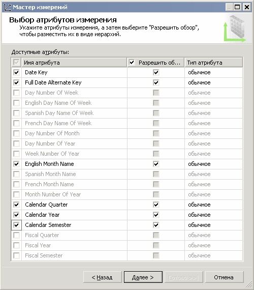 Нажмите кнопку "Далее". На странице "Выбор атрибутов измерения" установите флажки для перечисленных ниже атрибутов (Рис. 9):