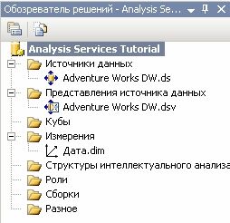 Чтобы завершить работу мастера, нажмите кнопку "Готово". В обозревателе решений в проекте "Analysis Services Tutorial" в папке "Измерения" появится измерение "Дата" (Рис.12).