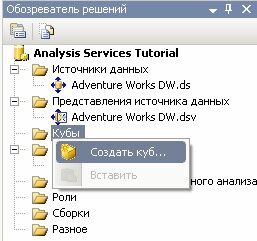 В обозревателе решений щелкните правой кнопкой мыши узел "Кубы" и выберите команду "Создать куб" (Рис.14).