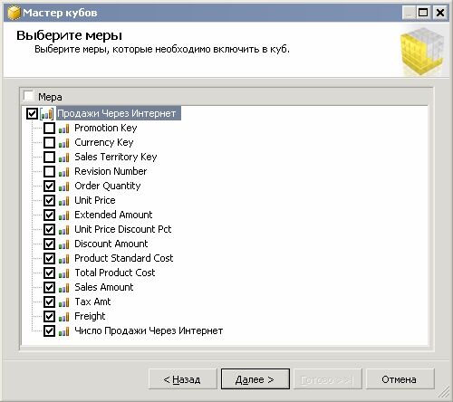 По умолчанию мастер выбирает в качестве мер все числовые столбцы в таблице фактов, которые не привязаны к измерениям. Однако эти четыре столбца не являются фактическими мерами. Первые три представляют собой ключевые значения, связывающие таблицу фактов с таблицами измерений, которые не используются в первоначальной версии этого куба.