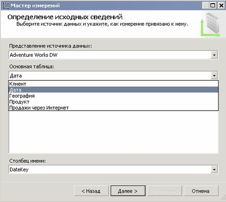 На странице "Определение исходных сведений" убедитесь, что выбрано представление источника данных Adventure Works DW. В списке "Основная таблица" выберите таблицу "Дата" (Рис.8).