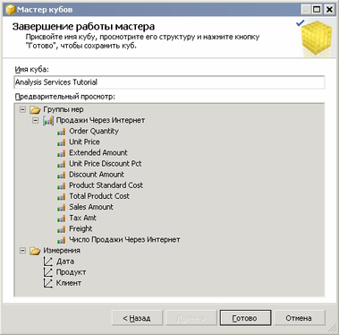 Нажмите кнопку "Далее". На странице "Завершение работы мастера" измените имя куба на "Analysis Services Tutorial". В области просмотра будет отображена группа мер "Продажи через Интернет" и входящие в нее меры. Кроме того, будут показаны измерения "Дата", "Клиент" и "Продукт" (рис. 19).