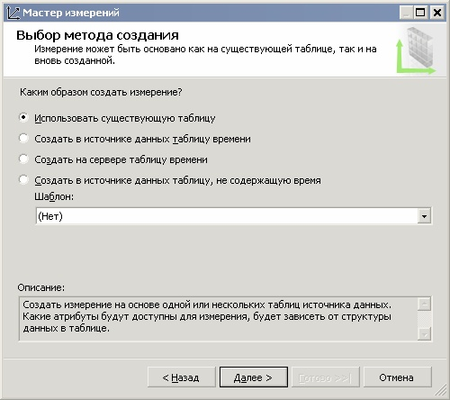 На странице "Мастер кубов" нажмите кнопку "Далее". На странице "Выбор метода создания" убедитесь, что выбран параметр "Использовать существующие таблицы", а затем нажмите кнопку "Далее".