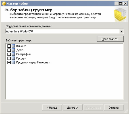 Нажмите кнопку "Предложить", чтобы мастер кубов предложил таблицы для создания групп мер. Мастер просматривает все таблицы и предлагает "Продажи через Интернет" в качестве таблицы группы мер (Рис.16). Таблицы групп мер, также называемые таблицами фактов, содержат меры, которые могут представлять интерес (например, число проданных единиц).