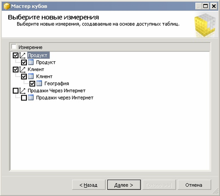 Нажмите кнопку "Далее". На странице "Выбор существующих измерений" выберите ранее созданное измерение "Дата" и нажмите кнопку "Далее". На странице "Выбор новых измерений" выберите новые измерения, которые необходимо создать. Для этого убедитесь, что установлены флажки "Клиент", "География" и "Продукт", а флажок "Продажи через Интернет" снят (рис.18).