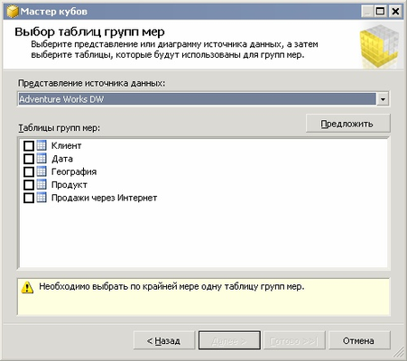 На странице "Выбор таблиц групп мер" убедитесь, что выбрано представление источника данныхAdventure Works DW (Рис.15).