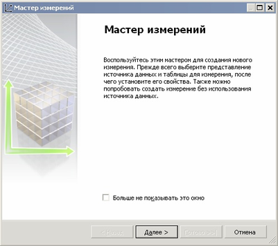 Мастер кубов помогает определить для куба группы мер и измерения. Далее с помощью мастера кубов будет построен куб.
