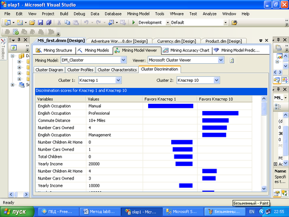 Вкладка Cluster Dicrimination позволяет сравнить два кластера:
