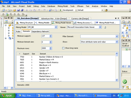 Вкладка ItemSets показывает частые наборы (которые часто встречаются у исходных объектов) и их поддержку (количество):