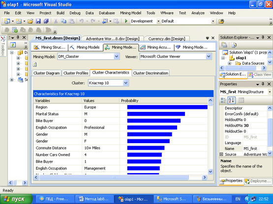Вкладка Cluster Characteristics показывает вероятность попадания в кластер объекта с определенным значением атрибута: