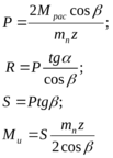 В общем случае нормальные усилия, действующее на поверхности зубьев в полюсе зацепления цилиндрической передачи, раскладываются на окружную Р, радиальную R и осевую S силы.