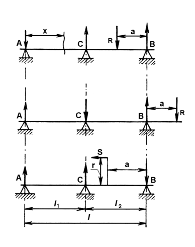 Следует отметить, что в случае комбинированного нагружения вала, например действия радиальной силы R и момента Sr, что возникает в случае косозубой цилиндрической передачи, на основании принципа суперпозиции реакции в опорах определяются суммой реакций от действия каждой нагрузки в отдельности.