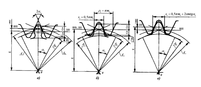С ростом х толщина зубьев на окружности вершин уменьшается, а у основания зубьев увеличивается. Одновременно растут радиусы кривизны эвольвент, очерчивающих боковые поверхности зубьев, и уменьшаются радиусы переходной кривой у основания зубьев.