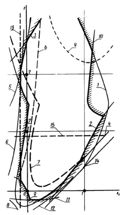 Блокирующие контуры для передач с внешним зацеплением при различных сочетаниях зубьев z1 и z2 прямозубых колес, нарезанных реечным инструмен­том без модификации исходного контура, приведены в Приложении 1. Аналогичные блокирующие контуры для пря­мозубых передач с внутренним зацеплением для шестерни, нарезанной реечным инструментом или долбяком, и колеса, нарезанным долбяком, приведены в При­ложении 2. Эти контуры с некоторым ограничением могут быть при­менены и для косозубых колес.