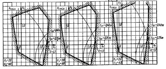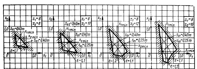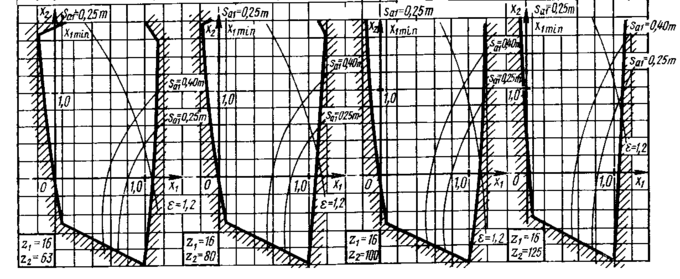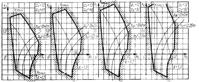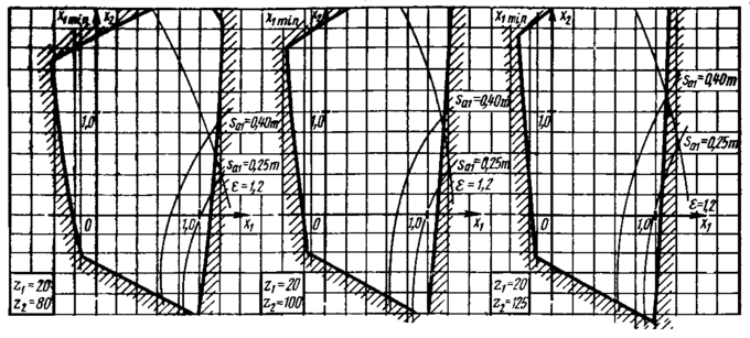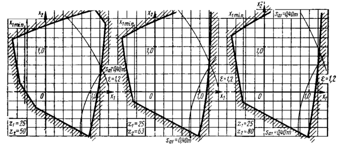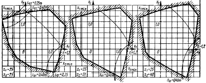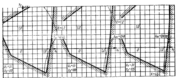 | 1 - граница подрезания зуба шестерни, не вызывающего уменьшения коэффициента перекрытия (верхняя точка активного профиля зуба колеса лежит на окружности вершин); 2 - граница подрезания зуба колеса, не вызывающего уменьшения коэффициента перекрытия (верхняя точка активного профиля зуба шестерни лежит на окружности вершин); | 3 - линия xmin шестерни; 4 - линия xmin колеса; 5 - линия ε = εα = 1,0; 6 - линия ε = εα = 1,2; 7 - линия sа1 = 0,0; 8 - линия sа1 = 0,25 m; 9 - линия sа1 = 0,8 m; 10 - линия интерференции зубьев. | |