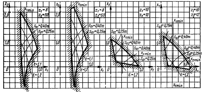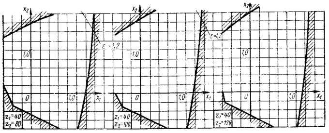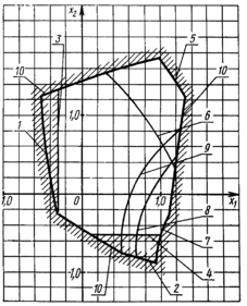 Блокирующим контуром называется совокупность линий в системе координат x1 и х2 ограничивающих зону допустимых значений коэффициентов смещения для передачи с числами зубьев зубчатых колес z1 и z2 На рис.1 приведен пример блокирующего контура.