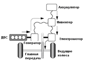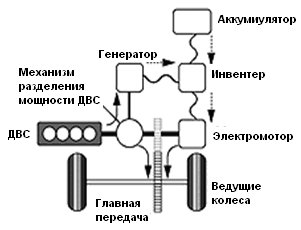 Существует множество вариантов построения гибридных трансмиссий. Наиболее часто встречаемые в открытой литературе это последовательные (рис.1) и параллельные (рис.2) варианты. В настоящее время все большее распространение получают гибридные трансмиссии с разделением мощности двигателя внутреннего сгорания (ДВС) (рис.3).