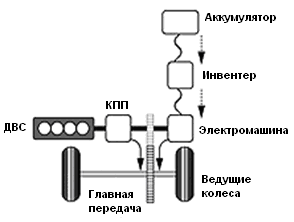 В случае параллельной гибридной трансмиссии (рис.2) электродвигатель располагается параллельно обычной механической трансмиссии. Электрическая машина может быть объединена с ДВС, трансмиссией или просто быть соединена с ведомым валом. В этом случае существует два независимых потока мощности. Регулирование передаточного отношения осуществляется с помощью механической коробки передач, а регулирование мощности с помощью электромотора. Поскольку имеется прямая механическая связь между ДВС и ведущими колесами, то частоты их вращения являются зависимыми друг от друга. Параллельные гибридные трансмиссии хорошо себя зарекомендовали при движении по магистрали, но оказались непригодными по экономическим соображениям для городских условий движения. Жесткая связь частот вращения ДВС и ведущих колес требует в этом случае использования в составе трансмиссии вариатора [2].