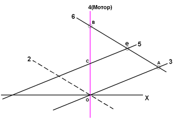 Из плана угловых скоростей видно, что для начала движения необходимо включить тормоз звена 3 и изменять частоту вращения электромотора, работающего в режиме электродвигателя, от нулевого значения (точка О) до максимального (точка А). В момент достижения оборотов электромашины максимального значения необходимо выключить тормоз звена 3 и включить муфту 6. Для дальнейшего разгона автомобиля обороты электромотора должны уменьшиться до нулевого значения. При полной остановке электромотора (точка В) скорость автомобиля будет иметь для текущего значения частоты вращения ДВС максимальное значение. В точке В частота вращения электромотора равна нулю, поэтому вся мощность, развиваемая ДВС, будет передаваться только механической частью трансмиссии, что приведет к увеличению КПД всей трансмиссии.