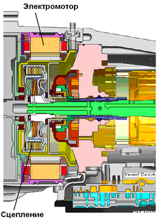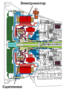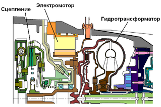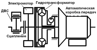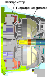 Немецкой фирмой ZF разработано семейство гибридных трансмиссий построенных так же, как и гибридная трансмиссия фирмы Honda, по параллельной схеме, но в отличие от нее вместо механической используется серийно выпускаемая автоматическая коробка передач. Причем наличие или отсутствие гидротрансформатора в составе трансмиссии определяется весом автомобиля и мощностью используемого на нем ДВС (рис.4 и 5).