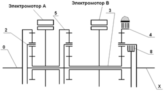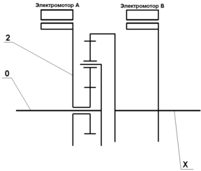 В случае разгона только за счет энергии аккумуляторов должен быть включен тормоз звена 4 напряжение подается на электромотор В, за счет чего его частота вращения начинает увеличиваться от нулевого значения. При этом электромотор А должен оставаться в нейтральном положении, т.е. свободно вращаться. Далее при определенной скорости заводится ДВС, электромотор А переводится в активный режим работы, и трансмиссия начинает работать в режиме разделения мощности ДВС на входе. При некоторой скорости происходит переход на второй режим со сложным способом разделения мощности ДВС.