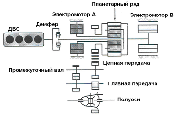 Первая серийно выпускаемая гибридная трансмиссия - трансмиссия с разделением мощности ДВС, называемая Гибридной Системой Toyota (THS), используется в автомобилях Prius [1]. Эта трансмиссия является развитием более раннего проекта, запатентованного в 1971 году Берманом. THS фактически представляет собой электромеханический механизм, в котором мощность передается от ДВС на ведомый вал трансмиссии двумя потоками (механическим и электрическим) независимо от того используется или не используется энергия аккумуляторных батарей. THS позволяет бесступенчато изменять передаточное отношение трансмиссии, но для этого необходимы два электромотора.
