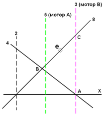 Движение автомобиля начинается при полностью заторможенном звене 4 и высокой частоте вращения электромотора А (звено 2) (точка О). Уменьшение частоты вращения электромотора А приводит к увеличению скорости вращения ведомого вала. При достижении частоты вращения звена 2 значения равного, примерно, 0,7 частоты вращения ДВС (точка А) тормоз звена 4 выключается и включается тормоз звена 3, т.е. в соответствии с планом угловых скоростей происходит мгновенный переход угловой скорости звена 5 из точки А в точку В. Дальнейший разгон осуществляется при остановленном звене 3 за счет дальнейшего уменьшения частоты вращения электромотора А (звено 2). При достижении этой частотой вращения нулевого значения вся мощность двигателя будет передаваться только механической частью трансмиссии.