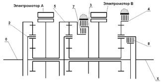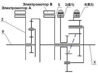 Электромоторы могут более эффективно обмениваться мощностью с аккумуляторными батареями. Использование блокировочной муфты 7 для получения фиксированных передач 1 или 3 полностью освобождает электромоторы от необходимости передавать часть мощности ДВС через электрическую часть трансмиссии, так что они могут быть использованы для потребления энергии аккумуляторных батарей или для их зарядки в режимах торможения. Энергия аккумуляторных батарей может быть особенно полезна для увеличения крутящего момента на ведомом валу при движении на первой фиксированной передаче 1, а при движении с высокой скоростью на четвертой передаче наиболее эффективно накапливать энергию в аккумуляторных батареях при торможении транспортного средства.